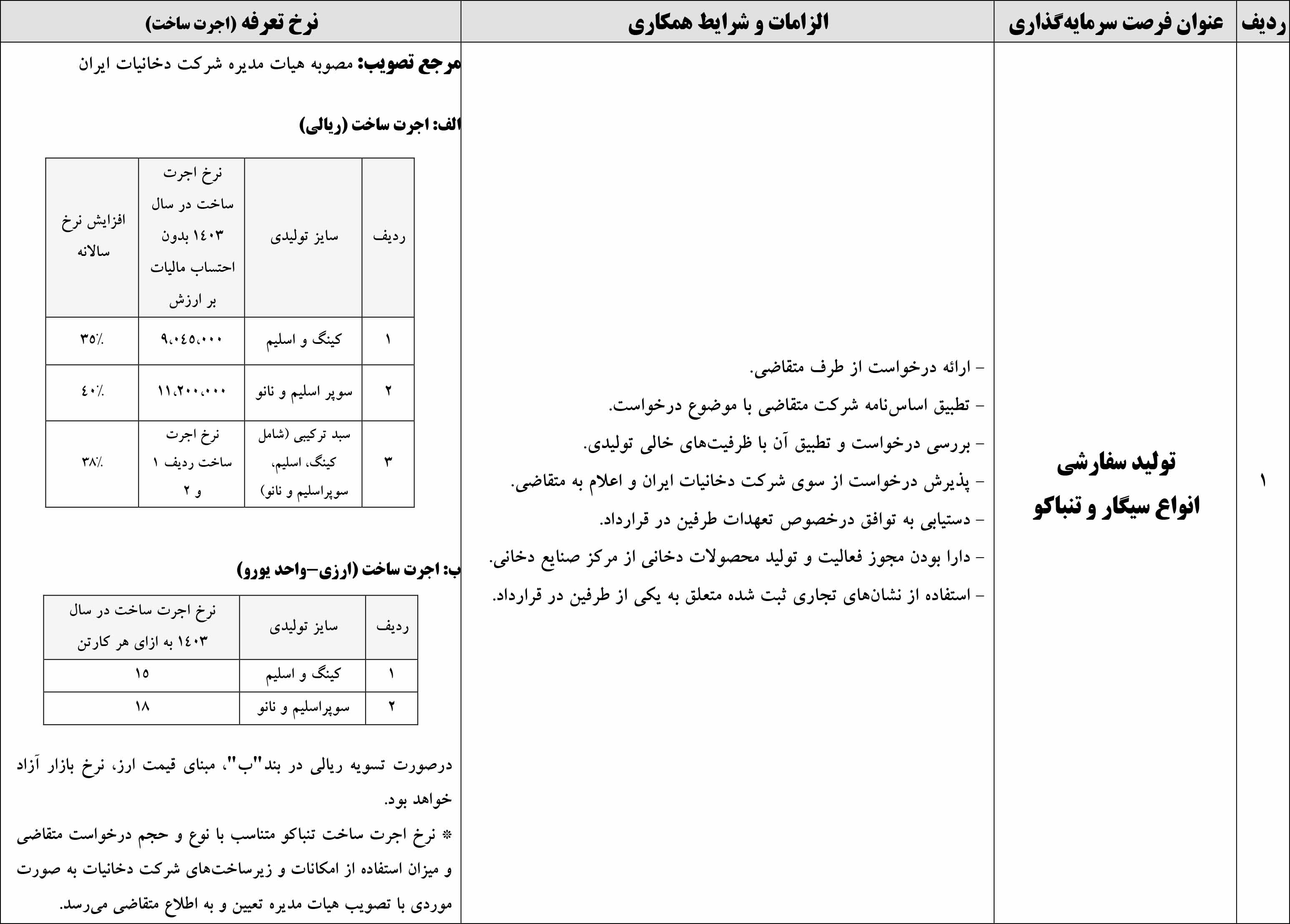 3 | سبد ترکیبی (شامل کینگ، اسلیم، سوپراسلیم و نانو) | نرخ اجرت ساخت ردیف 1 و 2 | 38% |